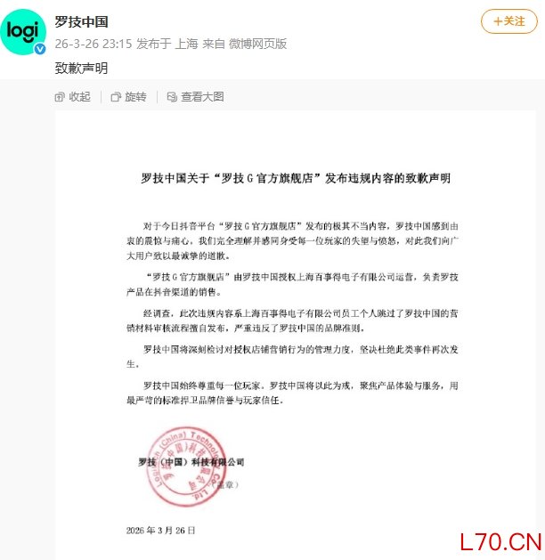 罗技中国就“罗技G官方旗舰店”违规内容致歉