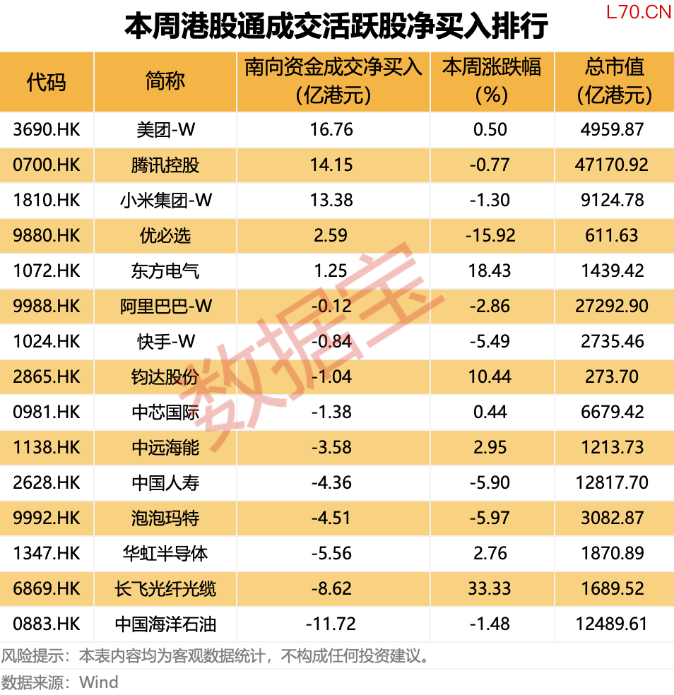 从成交净买入金额来看,南向资金对互联网巨头加仓态势明显,美团-W本周获南向资金净买入金额最高,达到16.76亿港元,腾讯控股、小米集团-W本周获南向资金净买入金额14.15亿港元、13.38亿港元。中国海洋石油、长飞光纤光缆净卖出金额居前,分别为11.72亿港元、8.62亿港元。