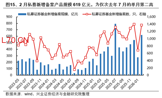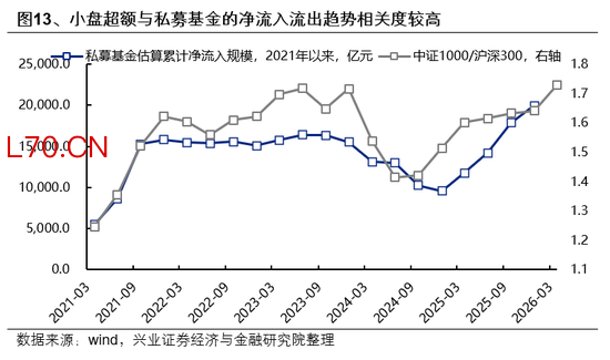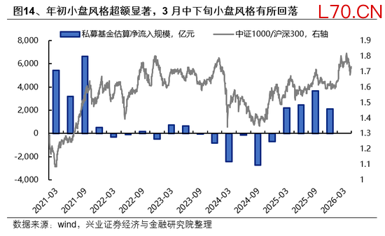 小盘超额表现与私募基金流入趋势相关度较高,考虑到一季度小盘风格先超额后回落,3月中下旬私募或有小幅减持。2025年私募新增备案产品规模近5000亿元,按照私募管理规模估算的去年净流入有1万亿元,其中私募量化产品是主要增长贡献,而私募量化在小市值因子上的下沉明显,驱动过去一年小市值因子超额与私募净流入相关度较高。今年年初在小盘风格超额明显,3月中下旬小盘风格有所回落,或指向私募在3月中下旬或有减持。