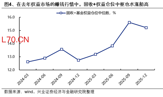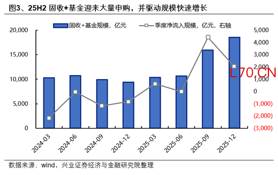 去年三季度以来,在权益市场赚钱效应驱动下,固收+产品规模快速增长。权益市场的赚钱效应一方面带来规模的被动增长,另一方面也吸引了绝对收益类机构资金与低风险偏好个人资金的参与增配,2025Q3&Q4固收+基金分别净流入约4400亿元与2000亿元。