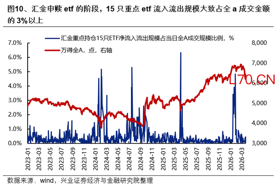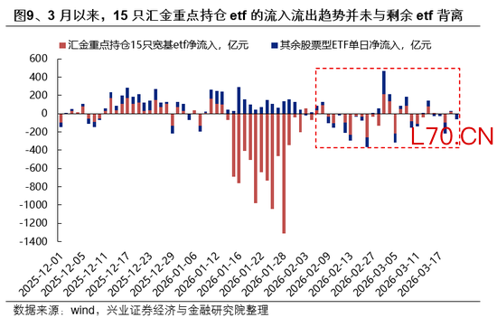 从跟踪数据来看,3月下旬汇金并未出手稳市。根据15只汇金重点持仓宽基etf的日度净流入数据,本轮市场调整以来,国家队资金并未出现显著的净流入。另外,汇金大幅申购赎回ETF时,15只重点ETF成交往往占全A的3%以上,本轮宽基ETF成交平稳、并未放量。