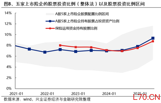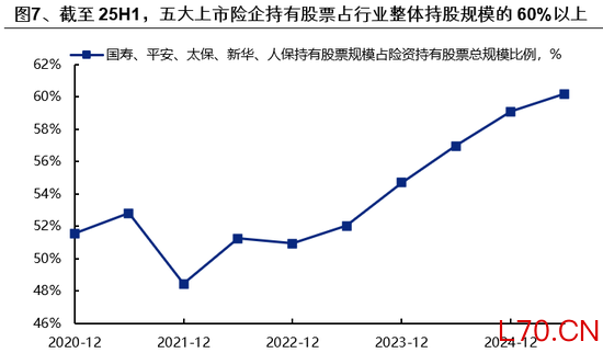 截至25Q2,五大上市险企持有股票占行业整体持股规模的60%以上,因此即使部分中小险企由于综合偿付能力充足率触及红线而要求降低权益资产比例,涉及的权益规模也较小。而头部险企的综合偿付能力充足率均在150%以上,意味着权益投资上限为30%,即使综合偿付能力充足率降至100-150%档位,20%的权益上限也是明显高于头部险企的权益头寸比例。