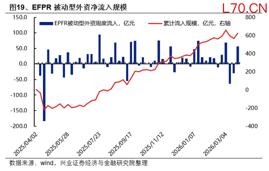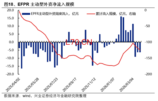 3月中旬以来,主被动型外资均有所流出,但3月最后一周被动型外资已转为流入。今年1月下旬至3月初,主动外资罕见趋势净流入,但随着美以伊冲突烈度的加剧,主动外资从3月中旬开始连续三周净流出,与此同时,被动型外资也连续两周转为流出,但3月最后一周已重回净流入。
