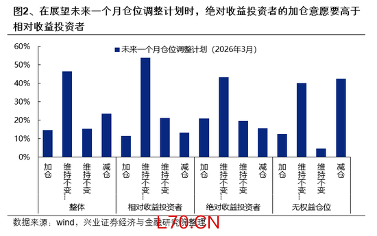 并且值得注意的是,保险与年金的新增运作资金持续高增,在权益资产上的配置需求旺盛,逢低增配建仓或是更被偏好的选择。根据我们3月23日至25日针对260+位本土核心投资机构的基金经理、投研负责人与总量研究员的调查结果来看,对于未来一个月认为可以“维持仓位不变,但需要调整结构”是相对收益投资者(54%)与绝对收益投资者(43%)的共识;但相对而言,绝对收益投资者的“加仓”意愿(21%)强于相对收益投资者(12%),绝对收益投资者的“加仓”意愿(21%)也强于“减仓”意愿(16%)。