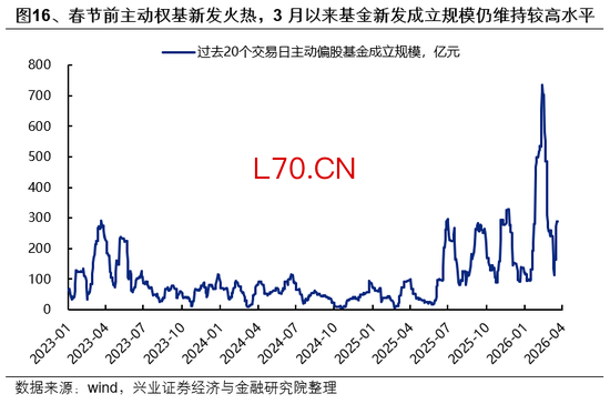3月基金发行仍维持较高热度,其中新成立基金以均衡配置与科技成长风格为主。今年以来,主动权基发行在去年下半年改善的基础上进一步升温,特别在今年春节假期较晚以及年初上涨催化下,春节前滚动20日新发成立规模升至700亿以上。而春节后基金新发仍维持较高热度,3月全月发行成立规模364亿元,其中以均衡配置与科技成长风格为主。
