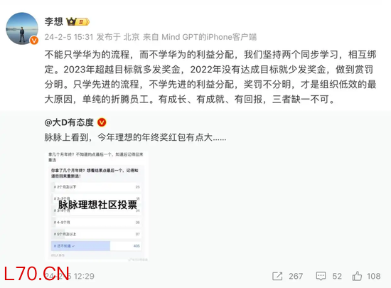 彼时,李想还在微博转发相关帖子时表示,“不能只学华为的流程,而不学华为的利益分配,我们坚持两个同步学习,相互绑定。2023年超越目标就多发奖金,2022年没有达成目标就少发奖金,做到赏罚分明。”